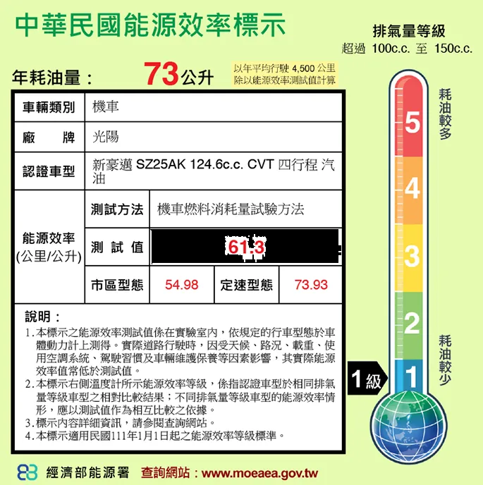 能源效率等級:1級 (超過100cc至150cc)
